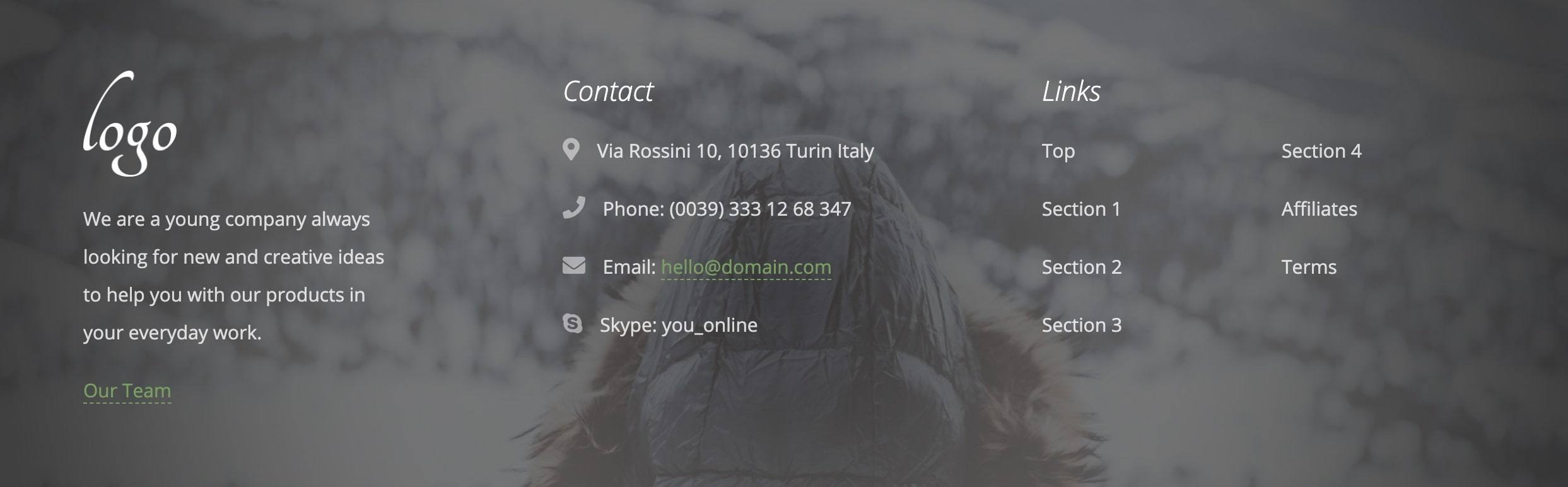 Fullscreen Background Image Bootstrap Footer Template has all the elements that make the footer design both visually appealing and functionally effective. The fullscreen background image is really a wise idea. You can change it to a featured image that can connect between your brand and your visitors.