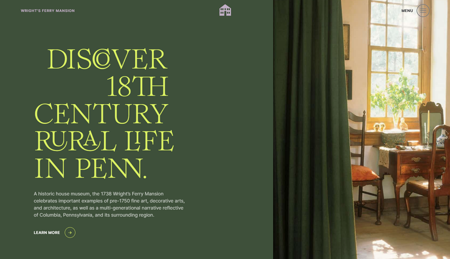 Wright's Ferry Mansion is an online website dedicated to introducing a historic house museum. It utilizes horizontal scrolling to gradually tell the house's historical stories. The designers have employed vibrant images of the mansion, soft color schemes, and touching narratives to create a warm and inviting user experience, making visitors feel as if they are listening to the stories of their own home.