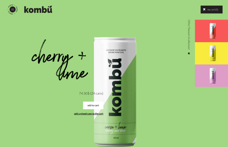 Beverage company Kombu showcases a bold design that breaks away from the conventional product page layout. Given that Kombu visitors are often returning customers who have already enjoyed the drink and are looking to order in bulk, there' no need for extensive descriptions or lifestyle images.